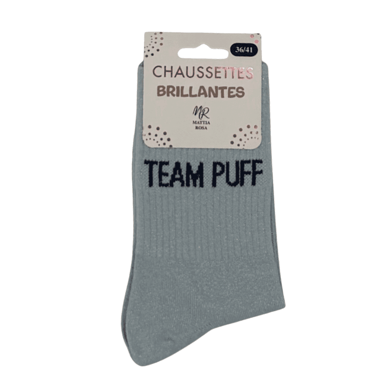 👉 Commande maintenant tes chaussettes à paillettes “Team Puff” grises et rejoins la team ☁️✨